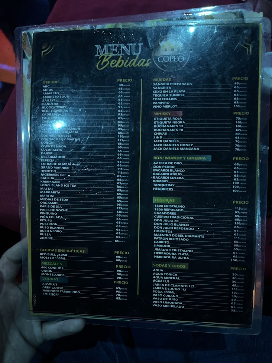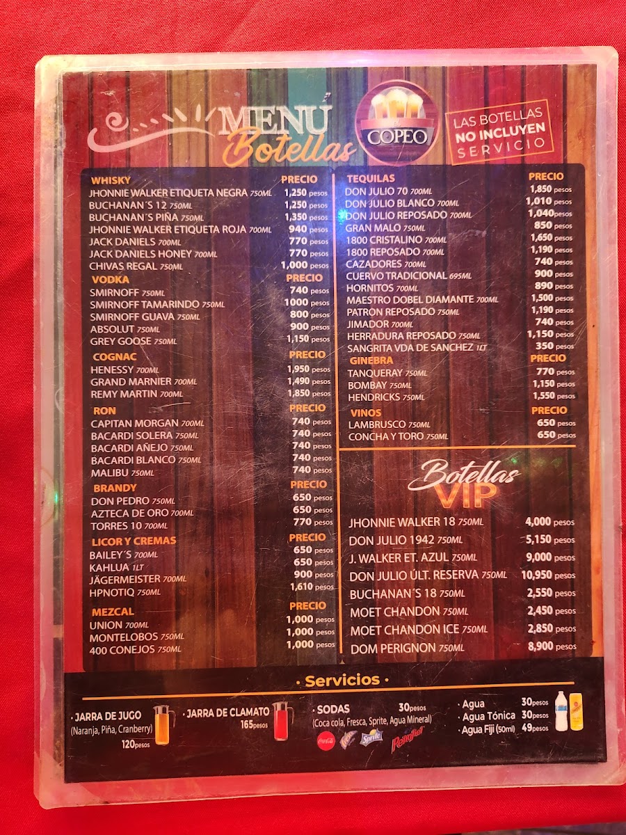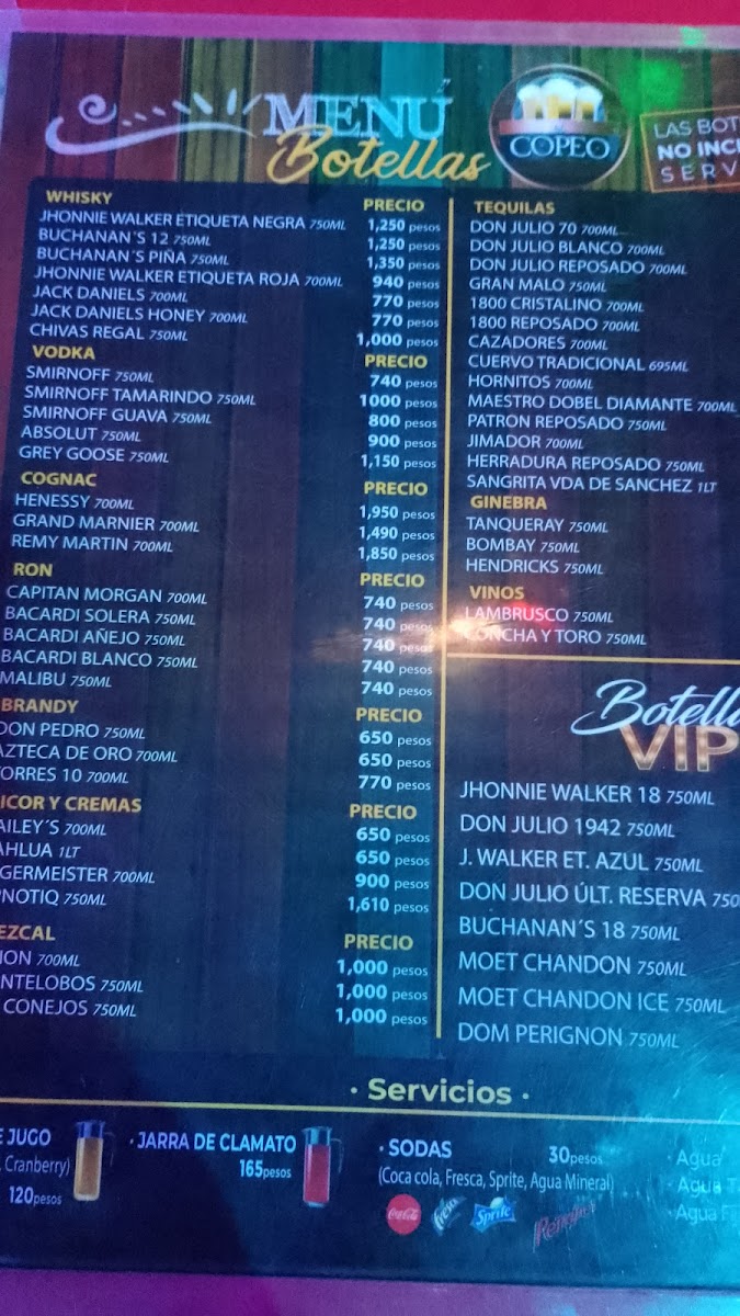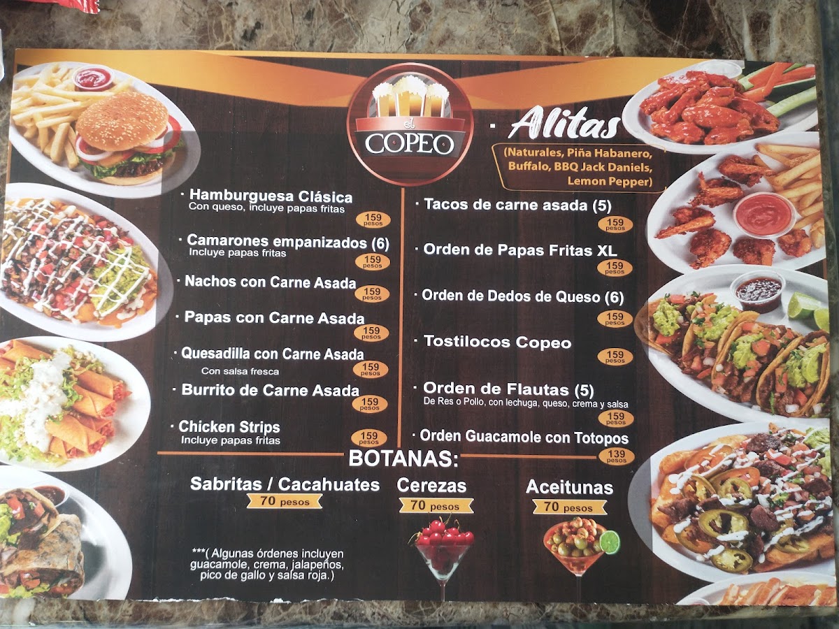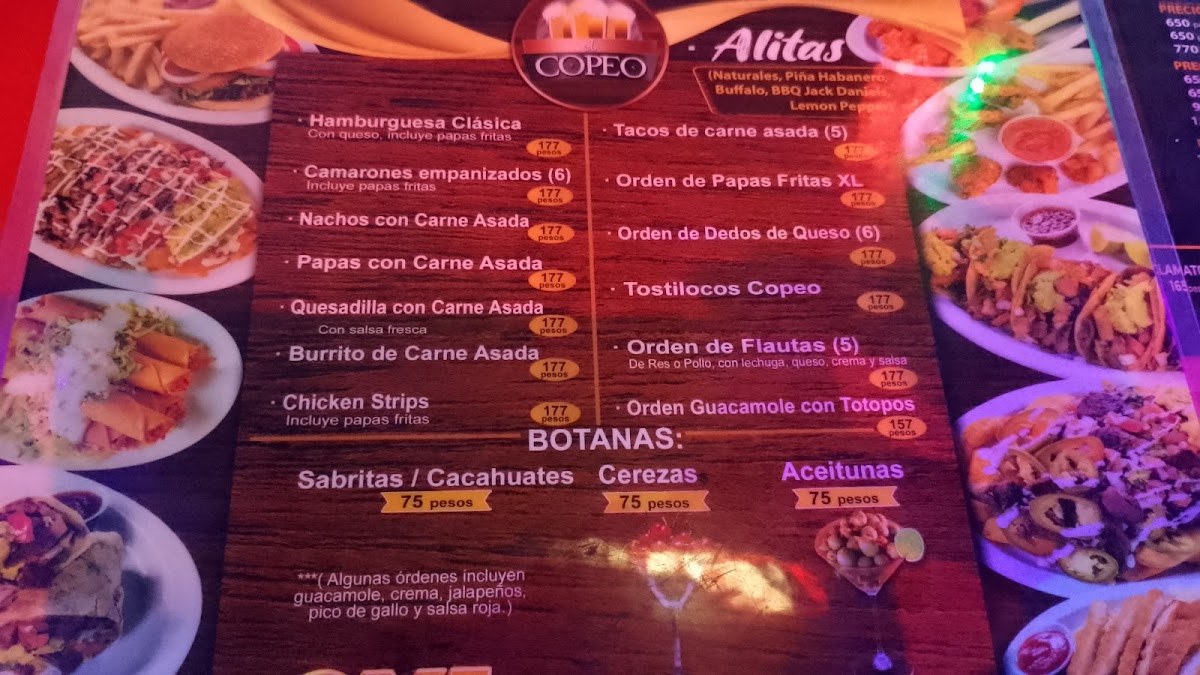 The menu at El Copeo features a variety of food and drink options suitable for casual dining and social gatherings. It offers a selection of appetizers and light bites such as Buffalo wings, nachos with meat, and fries. There are also pizza options available, providing a range of flavors for different preferences.